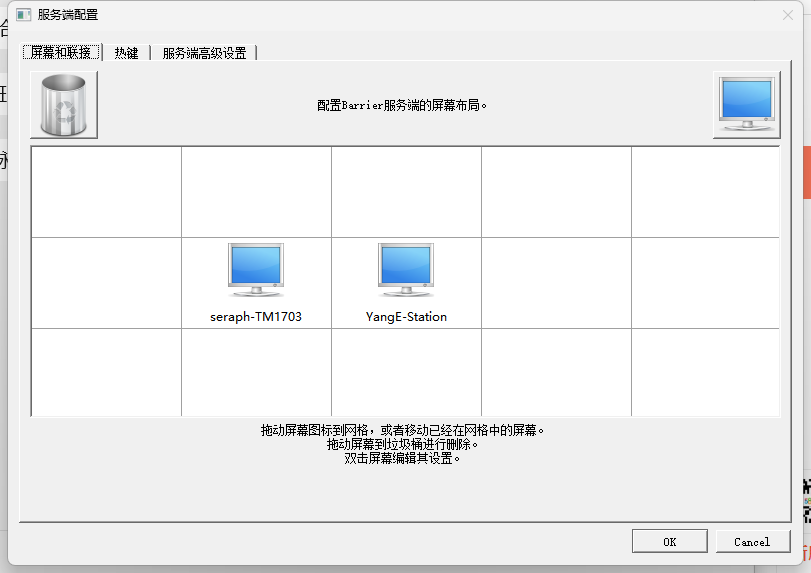 - 屏幕名称使用主机名即可。默认会自动带出主机名,服务器端和客户端都一样。尽量不要改,改了可能会出现奇怪的问题,比如用热键可以切换但不响应鼠标切换。实在想改屏幕名称,先改主机名,再改屏幕名称(只有首次运行时会带出主机名,改完主机名即便重装 Barrier 屏幕名称也是上次设置的)。这个一定要注意!