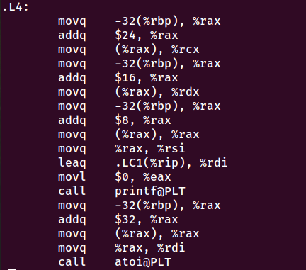 对于argv,其存储在栈中-32(%rbp),是main的第二个参数,用于访问用户输入的参数。