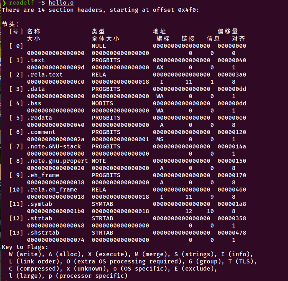 输出:hello.o——可重定位目标文件(ELF格式),含.text、.data等段,但未绑定实际地址。