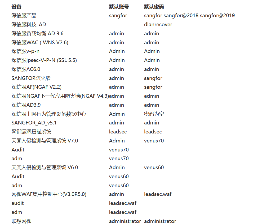 根据网上整理的设备默认密码可以得知,大部分口令或多或少都跟厂商有关