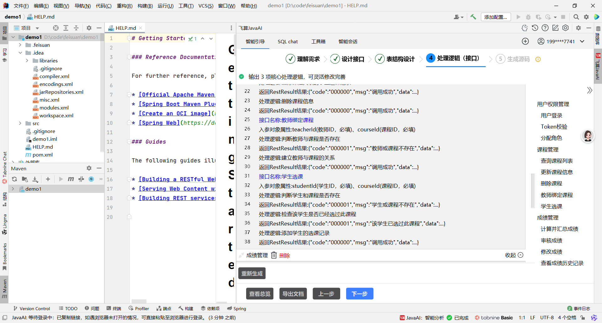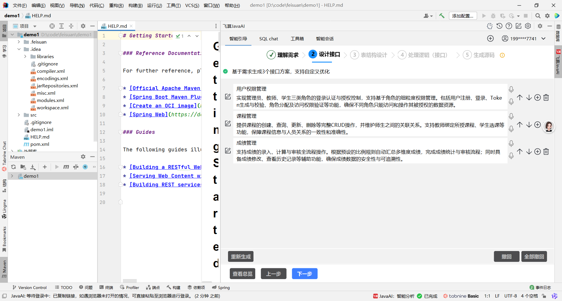 打开IntelliJ IDEA并启动飞算JavaAI插件,在“需求输入”界面输入提示词:“开发学生成绩管理系统后端代码,基于Spring Boot 3.0和MySQL 8.0,需包含用户权限(管理员/教师/学生三类角色)、课程管理(课程CRUD与师生关联)、成绩管理(成绩录入/计算/审核)三大核心模块,生成实体类、Mapper接口、Service层、Controller层代码,符合RESTful API规范,需支持成绩自动计算(按比例汇总)与权限细粒度控制(如教师仅能操作所授课程成绩)。”
