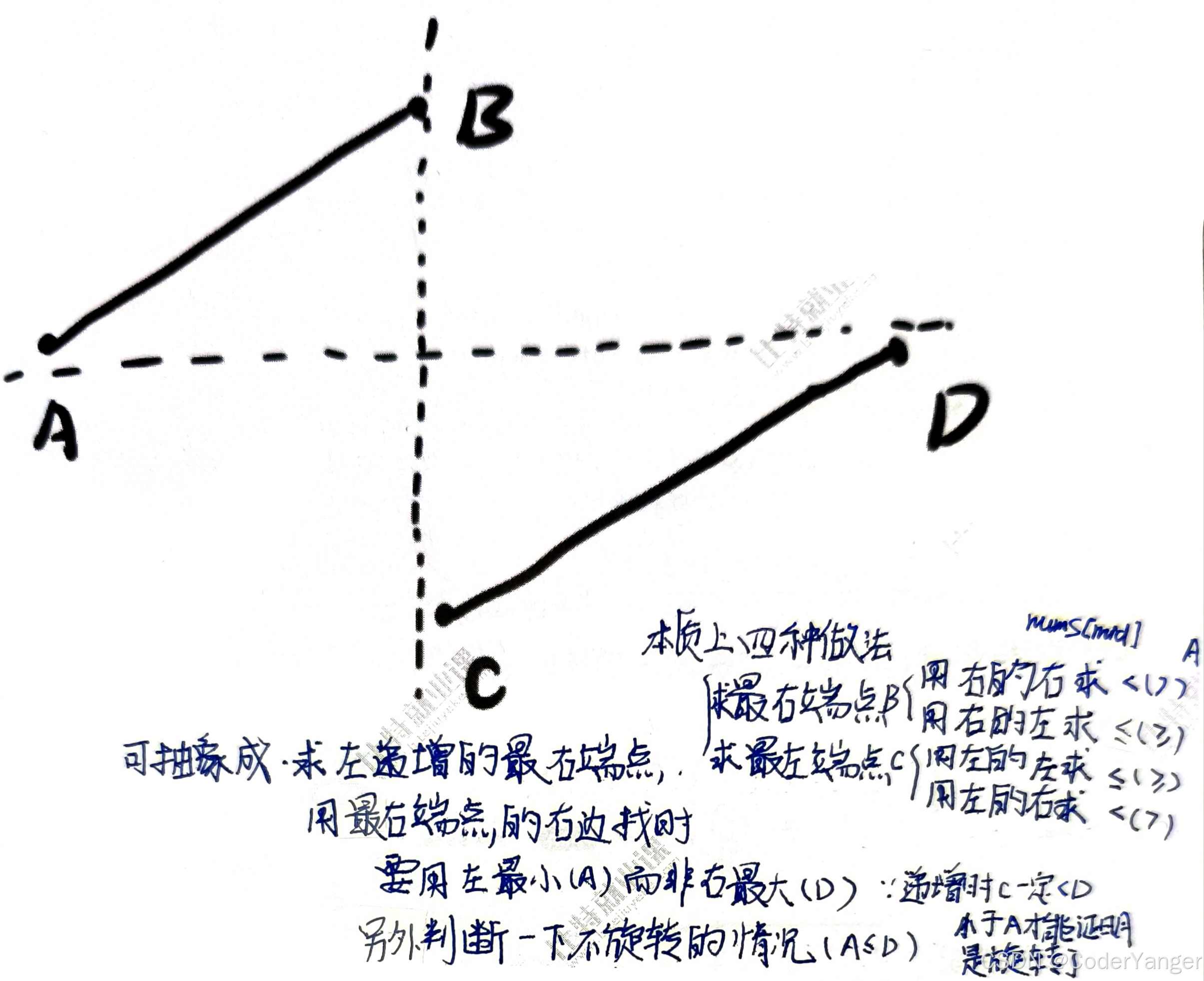 ①mid在B的右边时,nums[mid]<nums[0]时,right往左靠,从而锁定B