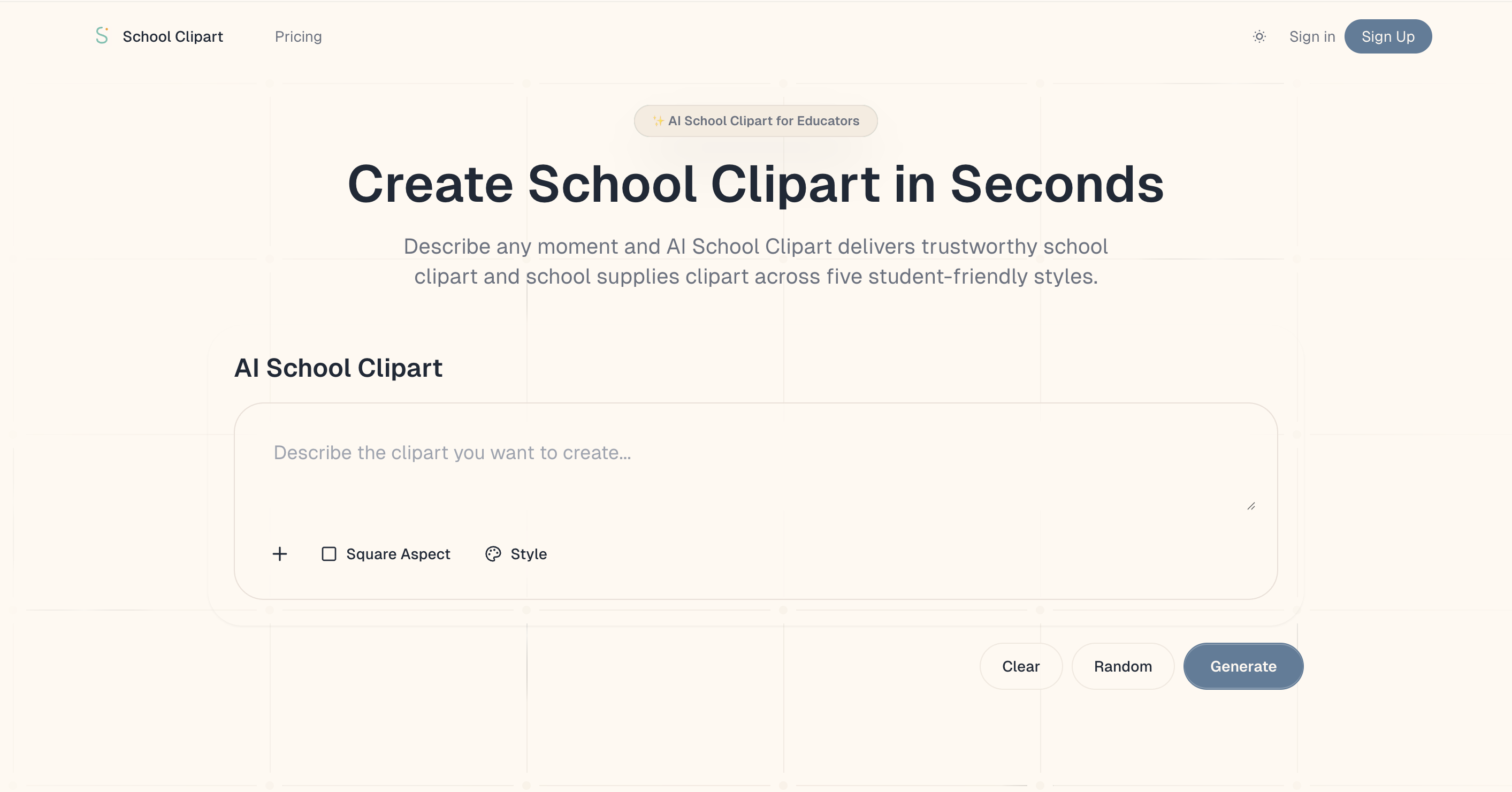 SchoolClipart.app 是一个能帮老师省很多事的网站。它可以用 AI 自动生成教学插画,只要输入想要的内容,比如“学生在实验室”“老师在讲课”“操场运动会”,几秒钟就能生成一张干净又可爱的图片。