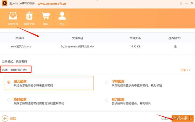 希望大家知道,想要取消密码是需要直到正确密码的,因为只有打开文件才能进行取消密码的操作,如果忘记了密码,我们需要先找回密码再进行取消密码的操作。比如使用超人 EXCEL密码解除助手中找回密码功能,有四种方法帮助我们找回excel文件的打开密码。
