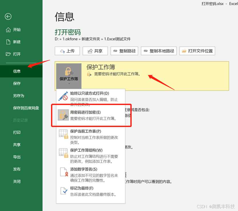 进入信息页: 点击左上角的【文件】选项卡,进入后台视图。在默认的【信息】页面中,找到并点击【保护工作簿】按钮。
