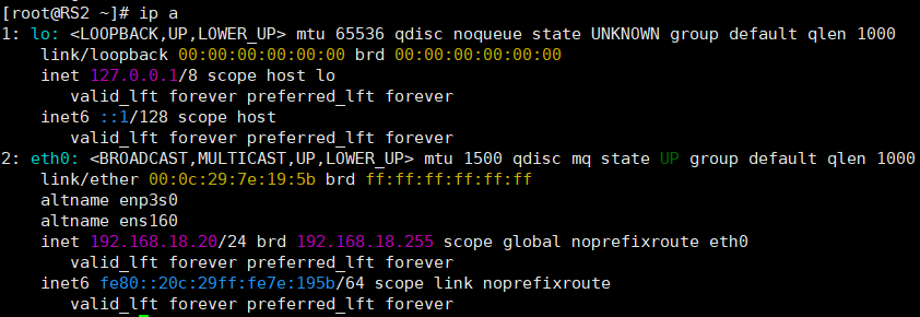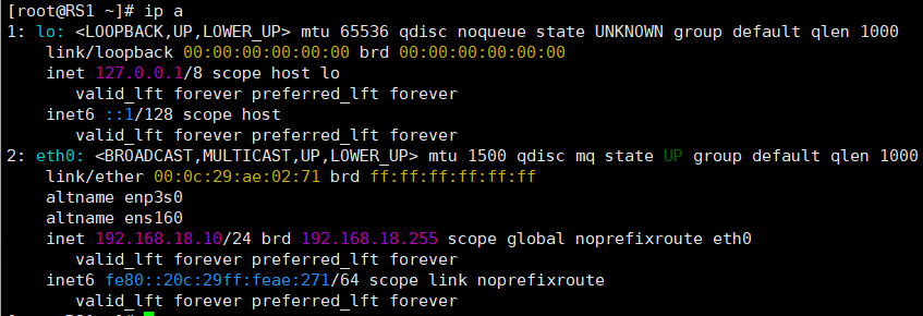 再使用ip a命令查看RS的IP地址,下图为RS1和RS2的IP