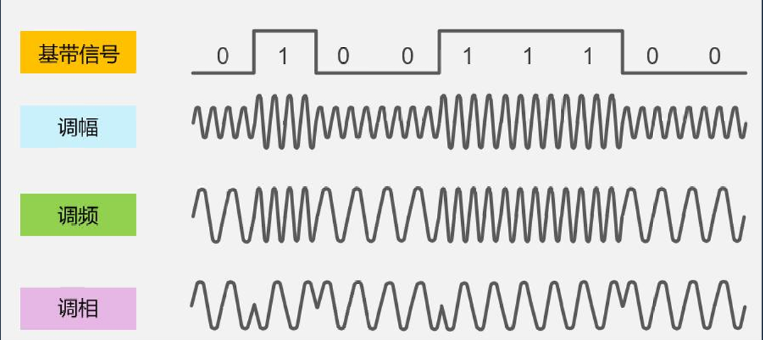 调幅(AM):载波的振幅随基带数字信号而变化,即幅移键控ASK (Amplitude-Shift Keying)。 调频(FM):载波的频率随基带数字信号而变化,即频移键控FSK (Frequency-Shift Keying)。 调相(PM):载波的初始相位随基带数字信号而变化,即相移键控PSK (Phase-Shift Keying)。