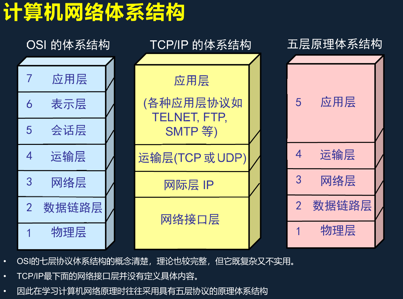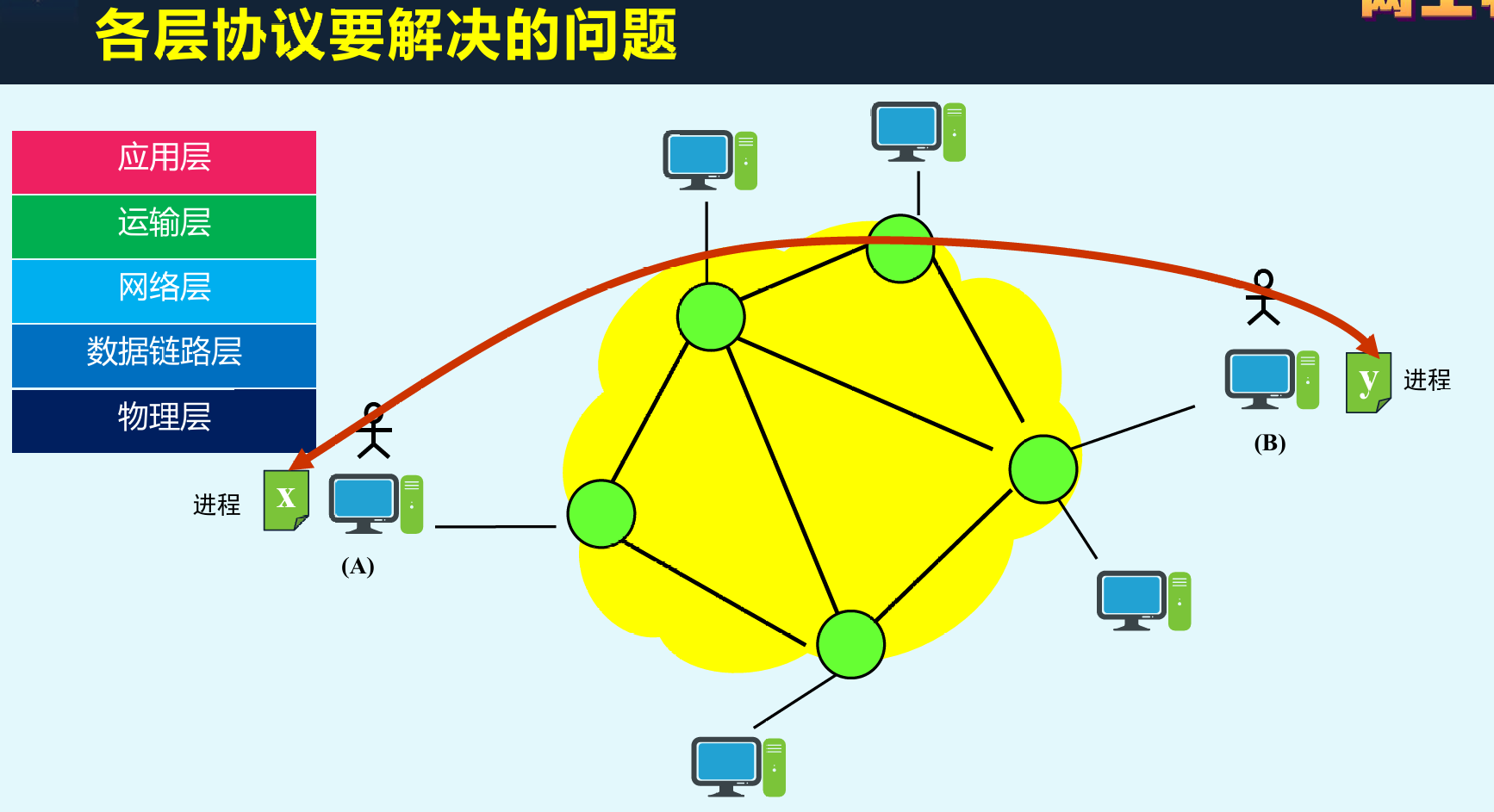 - 应用层:进程交互;运输层:端到端传输(端口);网络层:路由转发(IP);数据链路层:相邻节点帧传输;物理层:比特流传输。