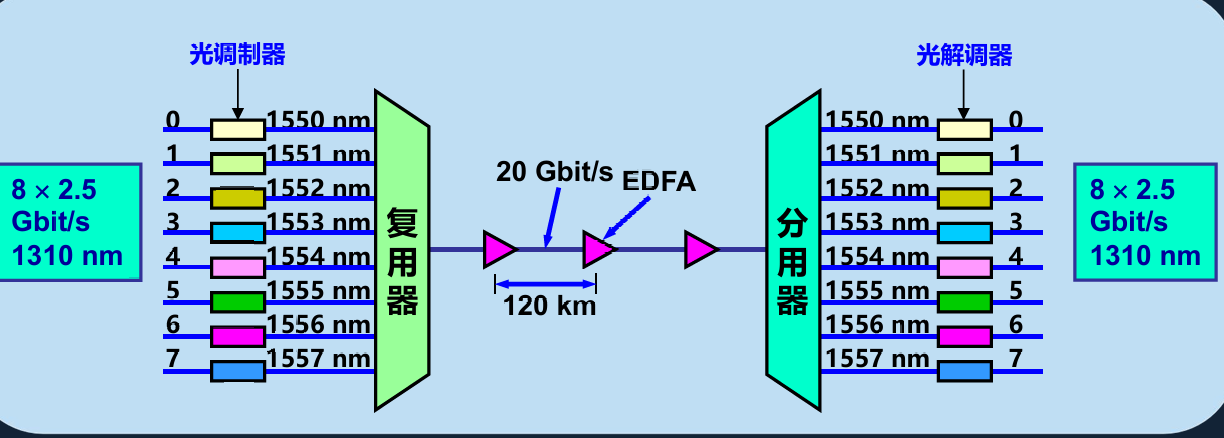 核心:本质是光的频分复用,利用一根光纤同时传输多个光载波信号。