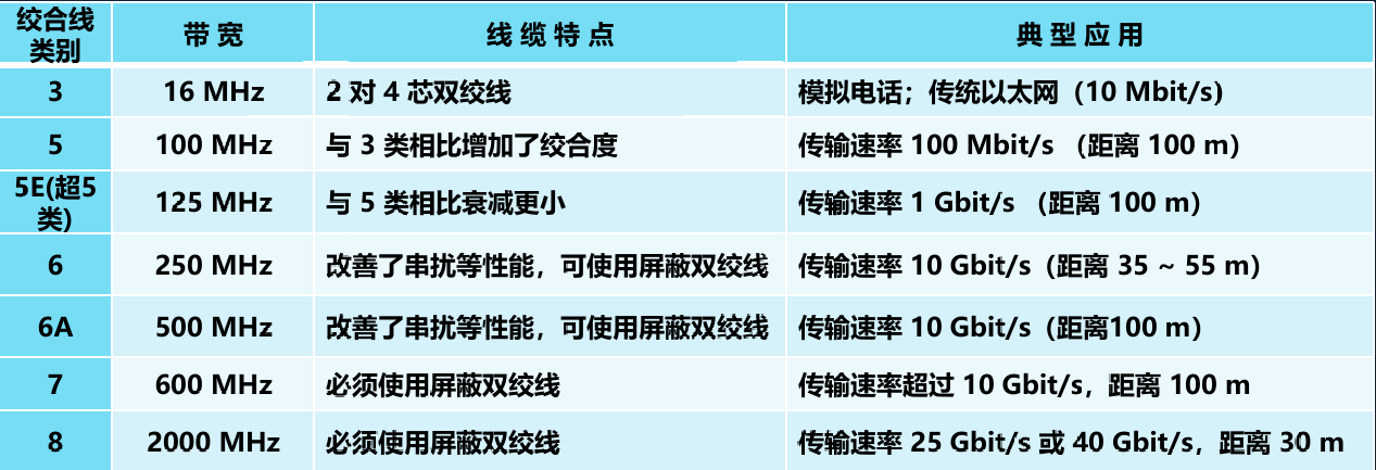- 导引型:双绞线(绞合抗干扰)、光纤(单模 / 多模,带宽大)、同轴电缆(抗干扰,有线电视)。