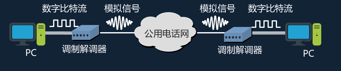• 数字数据转换成模拟信号的过程称为调制(Modulation),相反为解调,modem进行
