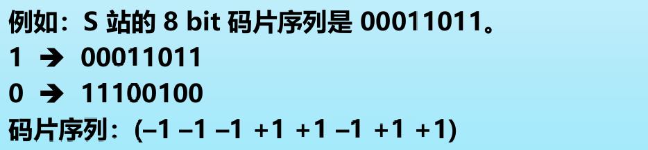 【例】 共4个站进行码分多址CDMA通信,4个站的码片序列为
